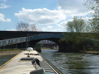 Believe it or not this is classed as a river section - you can just see on the right a stone structure that takes the towpath over the weir, which is something of a non-event. Maybe it gets a bit more scary when the rivers in full flow, but it was at the top of the green on the board which means that only an inch or two means you have to proceed with caution. I was doing this on my own at this point so it shows you that it's really nothing. John was up ahead opening the lock for me that is under the bridge ahead.